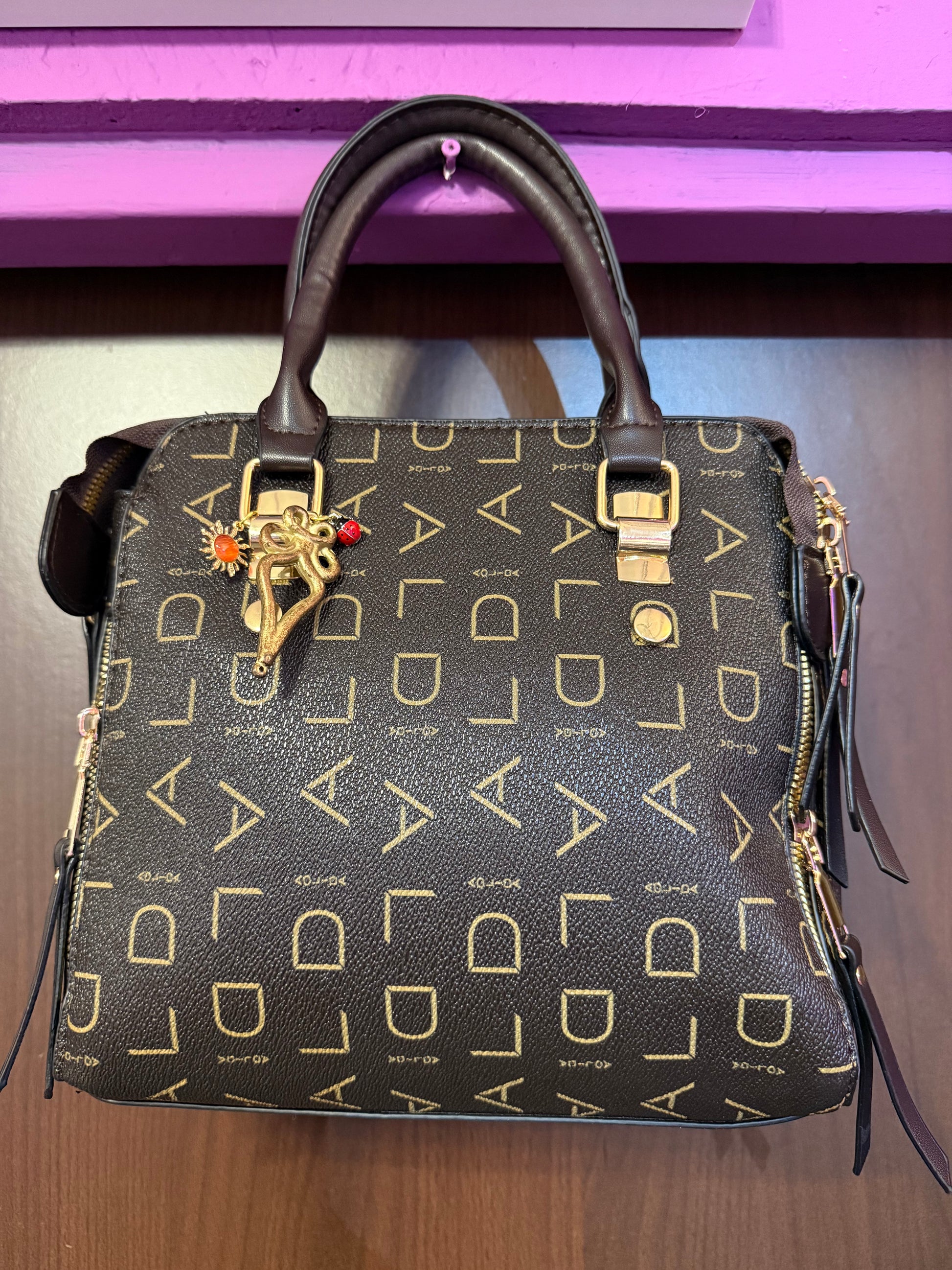 Maak een onmiskenbaar modestatement met deze luxe handtas! Het opvallende all-over logopatroon in goud/cognac op een diepbruine basis geeft deze tas een exclusieve en designer uitstraling.