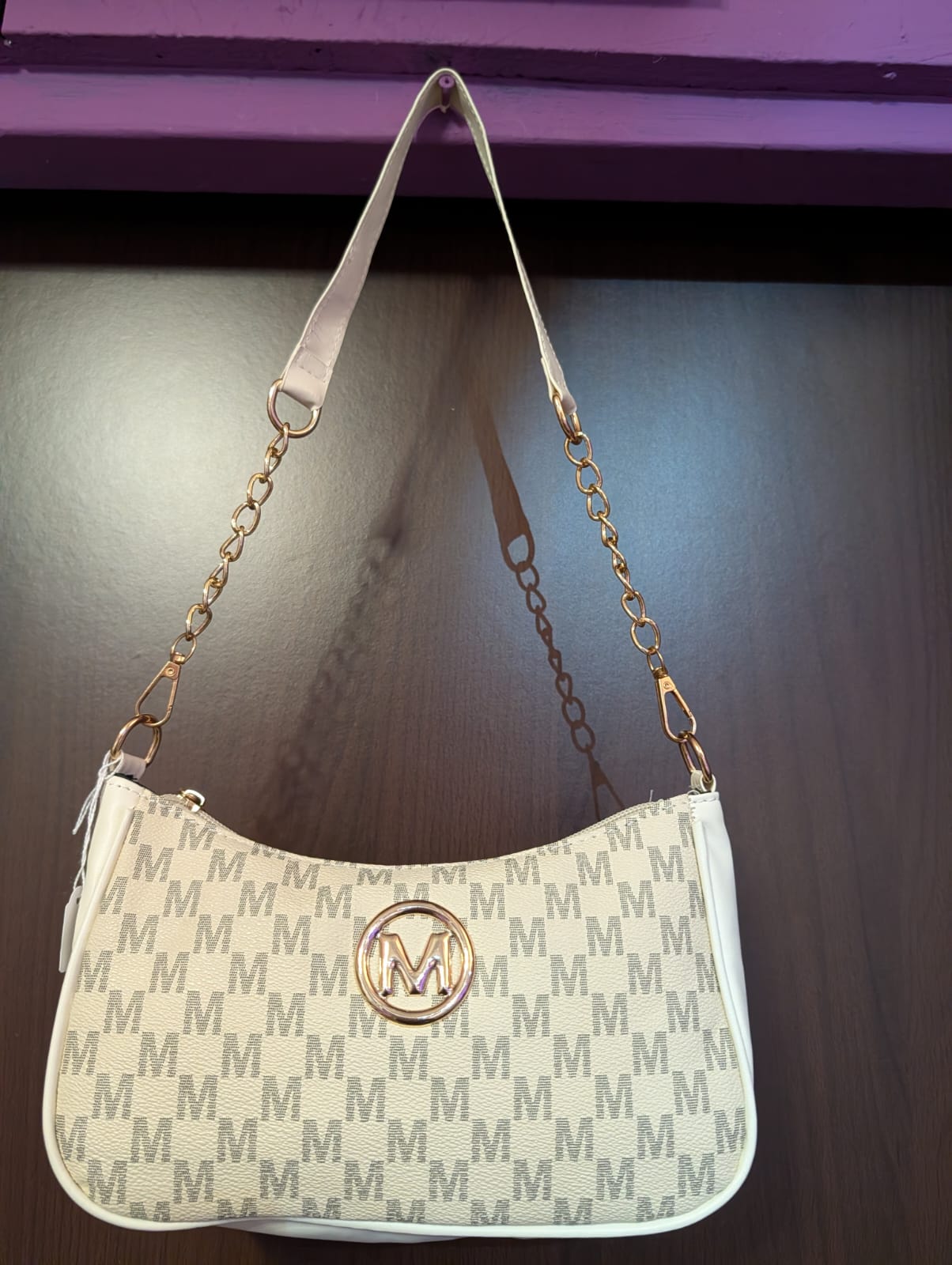 Deze compacte schoudertas heeft een luxe designer-look dankzij het all-over M-monogramen de goudkleurige details. De combinatie van Wit PU-leer, goudkleurige chain-schakels en het ronde M-embleem op de voorkant geeft de tas een elegante uitstraling zonder overdreven te zijn. Ideaal voor dagelijks gebruik, uitgaan of als classy finishing touch bij je outfit.