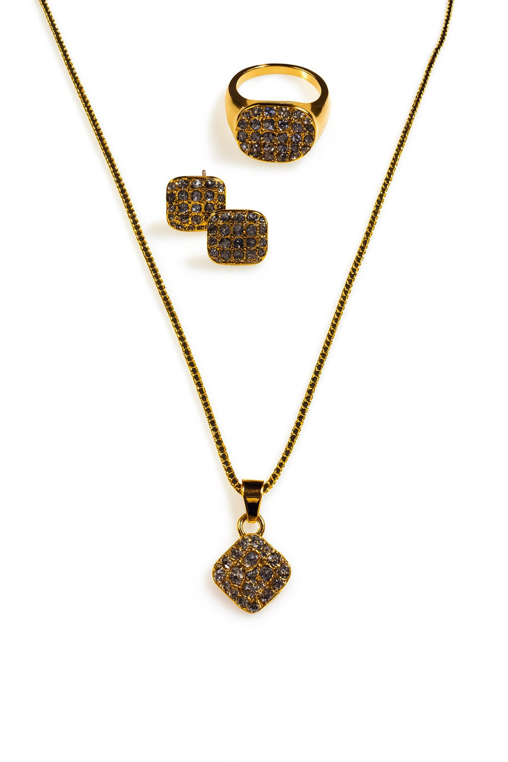 Deze luxe sieradenset bestaat uit een elegante gouden ketting, bijpassende oorbellen en een ring. Elk stuk is subtiel afgewerkt met fonkelende steentjes die het licht prachtig opvangen. De perfecte combinatie van eenvoud en glamour – ideaal om te dragen bij zowel dagelijkse outfits als feestelijke gelegenheden.